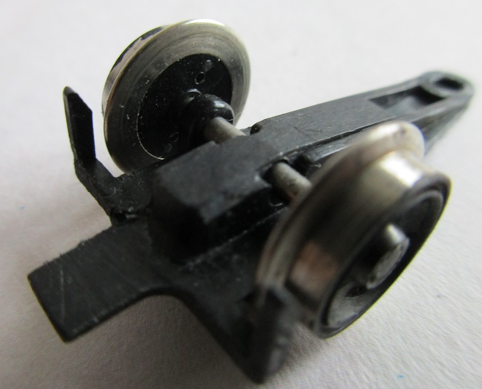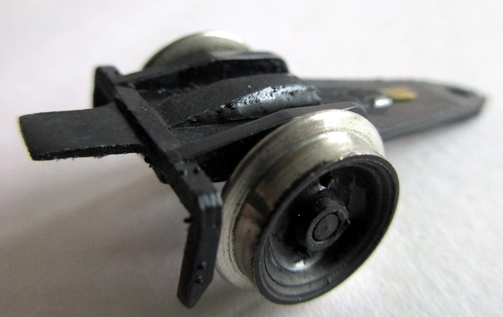 Un morceau de circuit imprimé de la largeur du châssis et de longueur adéquate, dont les pôles positif et négatif sont séparés (isolation électrique) puis fixé sous la chaudière entre les essieux (micro vis de récup horlogerie). 3 languettes cuivrées sont soudées sur chacune des 2 pistes de manière à frotter sur l'intérieur des roues des 3 premiers essieux embiellés (petits réglages pour garder une certaine souplesse et un bon contact) :