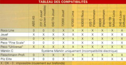 La Disponibilité : votre plan de réseau est prêt et vous n'habitez pas (et c'est mon cas) dans une grande ville (même si la mienne compte 60 000 habitants) et donc votre revendeur risque fort de ne pas avoir de Peco (par exemple) en stock. Soit !,vous persistez, alors n'oubliez pas le bout de rail X la courbe Y ou encore l'aiguillage Z dans votre commande, je prends le pari d'un oubli.La Compatibilité avec le matériel : Aie Aie, et oui, le passage d'un wagon sur un rail pas assez haut va entraîner un roulement sur les tire-fonds, et là... c'est pas bon, mais pas bon du tout ! voyez un tableau des compatibilité ci-dessous.