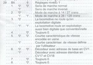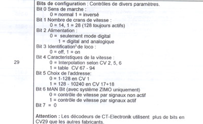 Donc, avec votre centrale vous allez pouvoir programmer chaque bit de chaque CV. Par exemple, toujours pour le CV 29 vous pourrez avec une centrale Intellibox si vous souhaitez faire fonctionner votre loco en 27 crans de vitesse (votre centrale devra elle aussi être en 27 vitesses) programmer le bit 2 du CV 29 en indiquant la valeur 0 (à voir sur l'extrait de la notice ci dessous).