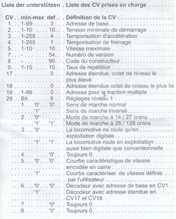 Ca y est, vous êtes devenu un utilisateur du digital, Bravo ! Seulement voila, vous venez d'acheter un nouveau récepteur, tenez, un des plus répandu sur le marché un LENZ par exemple dont la notice vous montre des tableaux avec une succession de définitions. Cela vous rebute car vous voyez une liste de CV avec des chiffres 1 ou 0 et vous vous dites la chose suivante : Comment je vais rentrer cela dans ma "bécane" euh non ma centrale ?