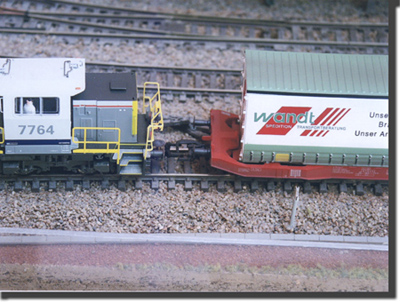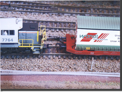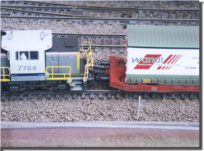 Ca y est la touche F2 de la centrale a été actionnée, regardez bien le piston levé tout juste derrière le premier tampon de la locomotive, il ne reste plus qu'a tirer la locomotive et le tour est joué. Grâce au conseil d'Alain la touche F4 peut rester actionnée au bout de quelques secondes selon la programmation le piston redescend, il ne reste plus qu'a l'actionner de nouveau si on souhaite faire fonctionner le dételeur.