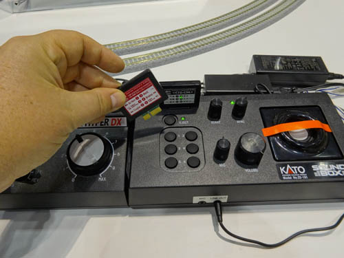 Ici pas de décodeur dans la machine, le réseau fonctionne en analogiuque, une carte représentant le son d'une machine est inséré dans le systeme. Le jumelage traction/dispostif sonore pemet de restituer le son en fonction de la vitesse; Une sortie externe est prévue pour brancher une petite enceinte style Bose. Sur le stand le suppositoire JBL restituait les sons.